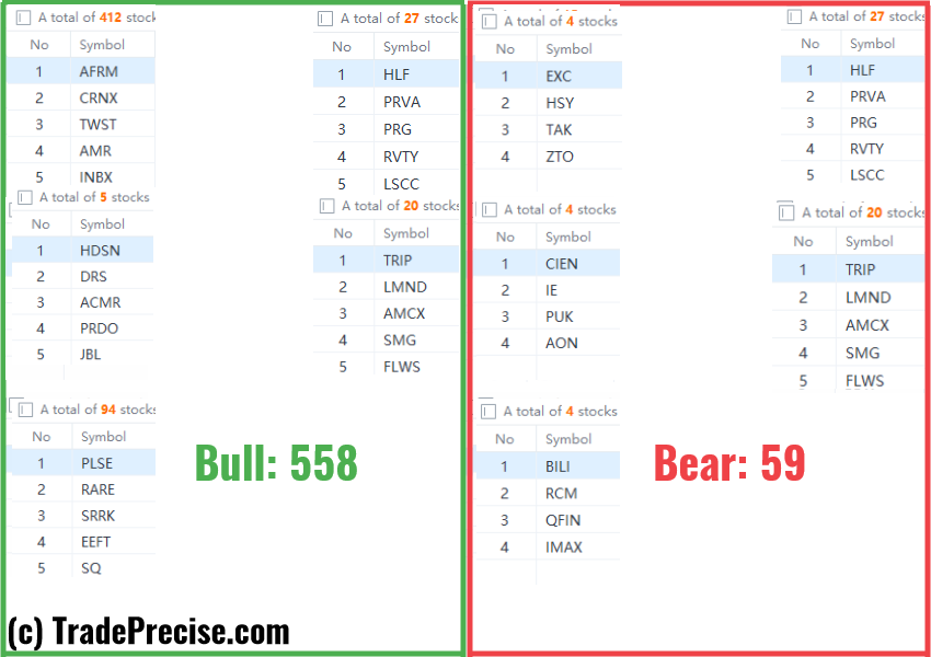 The bullish vs. bearish setup is 558 to 59 from the screenshot of my stock screener below pointing to a healthy and positive market environment.