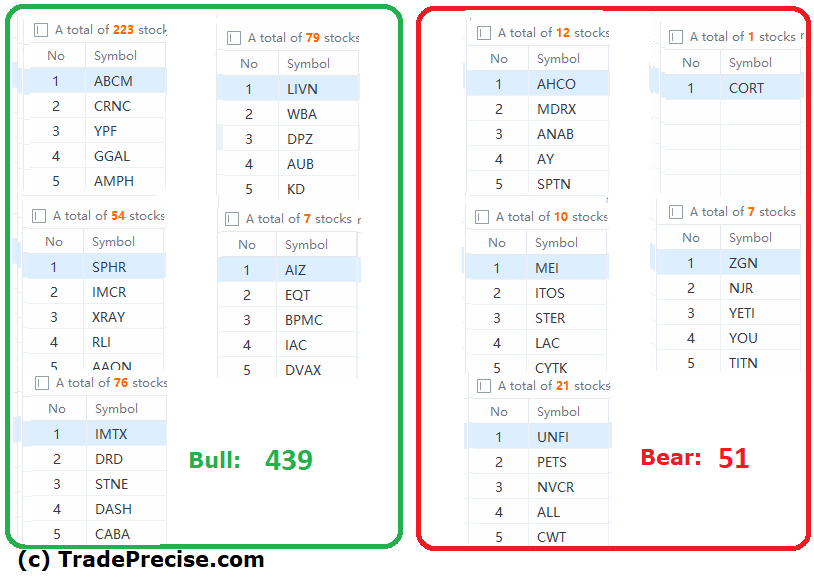 The bullish vs. bearish setup is 439 to 51 from the screenshot of my stock screener below pointing to a positive market environment.