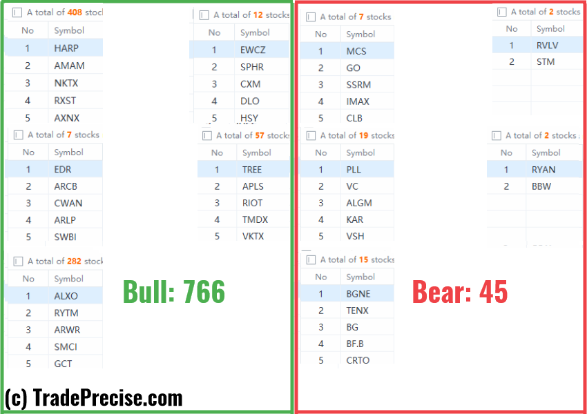 The bullish vs. bearish setup is 766 to 45 from the screenshot of my stock screener below pointing to a healthy and positive market environment.